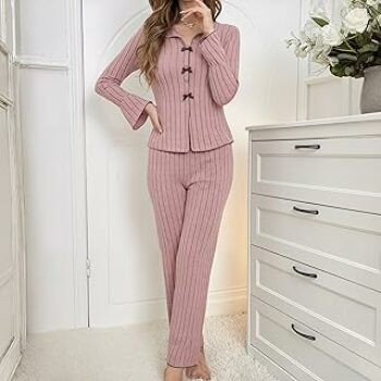 Generic Set da notte da donna, a costine, camicia a maniche lunghe e pigiama con pantaloni lunghi – B0FRMF1JGR