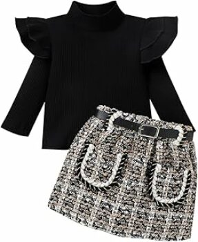 LUVCES Abbigliamento Bambina Vestito Set Manica Lunga Volant Top + Bottoni Papillon Minigonne 2 Pezzi Ragazze di Vestiti Outfit – B0DHTTPY5P